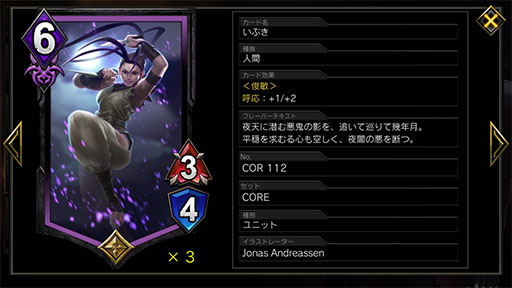 勝ち手段としては,「いぶき」「レイレイ」を除去できないサイズまで育て,一気に押し切るパターン。そのため,ユニットを出した直後にアクションカードを連続して使用することを徹底したい。ちなみに,これが通用するのは相手のヒーローアーツ「真空波動拳」がたまっていないことが前提なので,相手のAPには目を光らせよう。一度破壊されても,「デビルトリガー」で時間稼ぎもできるので,相手の盤面が埋まったタイミングで再度攻勢を仕掛けるなどすれば,勝機が見えてくるはずだ。