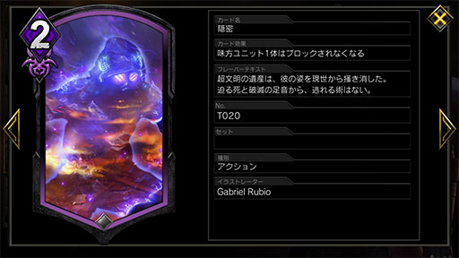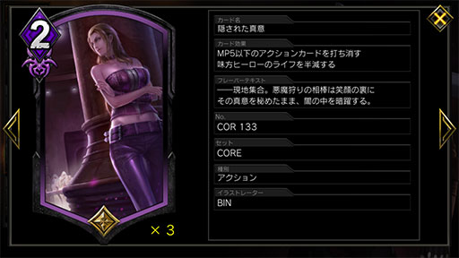 このデッキは「いぶき」「レイレイ」をなんとしても除去されないように立ち回らないといけないので,そのための打ち消しアクションは非常に重要となる。その代表格といえるのが,「停止モリガン」にも採用されていた「隠された真意」。使用時のデメリットとしてヒーローのライフが半減してしまうが,相手の5MPまでのアクションを2MPで打ち消せるのは強力。ライフの半減効果も,ヒーローアーツの「デビルトリガー」を使えばある程度補えるので,このデッキとの相性が良いカードだ。
