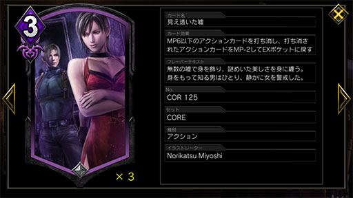 さらにコストが4MPになると,「隠された真意」で打ち消せるようにもなる。「ウロボロスウェスカー」「リベンジウェスカー」などを相手にするときのキーカードになるので,意識して「抹殺」にぶつけていこう。