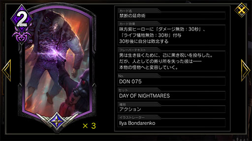 「停止モリガン」デッキと大きく違うのは守りの手段だ。「停止モリガン」の守りは停止系のアクションカードと,停止状態のユニットを破壊するヒーローアーツ「ダークネスイリュージョン」だったが,「デビルトリガーダンテ」の守りは10秒間ヒーローへのダメージを無効化する「デビルトリガー」,そして「DAY OF NIGHTMARES(以下DON)」で新たに登場した無敵効果を得られるカード「禁断の延命術」となる。