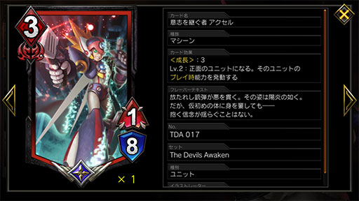 また,初手であまり出すことはないが,受けの成長ユニットとして覚えておきたいのが「意志を継ぐ者 アクセル」だ。「成長:3」の効果で正面の敵ユニットをコピーするという効果は強烈。相手が強力なユニットを出してきたのに合わせて出すと,カウンターパンチを決められる。
