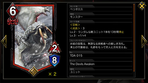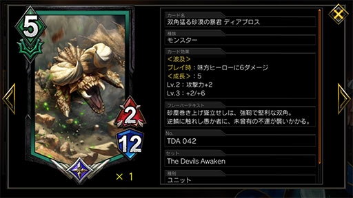 緑系の流行デッキである“真の力ネロ”“あくび春麗”に対しては,比較的五分に戦えるのだが,相手の初手で「双角猛る砂漠の暴君 ディアボロス」が出てきたときには,厳しい戦いを強いられる。素のHPも12と高いのに,Lv3になると6/18というステータスになり,ダメージ効果のみで除去するのが非常に困難。さらに「成長」持ちであるため,「防御フィールド」「風の鎧」といった「成長」持ち限定の強力なバフの対象となり,これらを併用されると,倒しきれずそのまま負けてしまうことも少なくない。