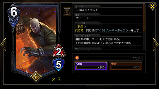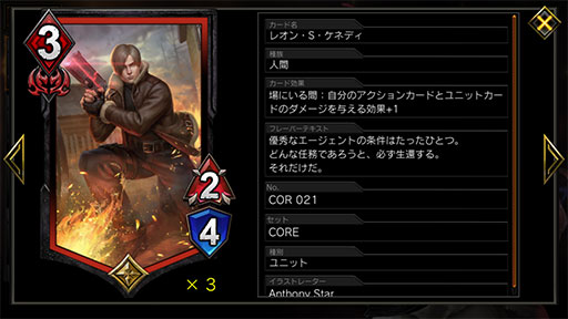 小技の紹介をもうひとつ。「レオン・S・ケネディ」のダメージ+1効果は,場に出た瞬間に,レベルアップ時のダメージ効果にも反映される。例えば,攻撃力2のラシードがレベルアップしたときのダメージ効果は通常2ダメージだが,「レオン・S・ケネディ」をプレイしてレベルアップすると,3ダメージを与えられるのだ。