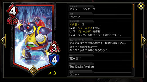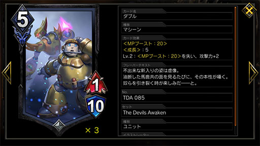 ダブルは「成長:5」の能力を持ち,レベルアップするとMPブーストは消えてしまうのだが,攻撃力が2上がって3/10のアタッカーになるので,それほど悪くはない。このユニットを展開したあとに,3MPのユニットを2体展開して3面から攻める動きはなかなか強いので,初手にあれば狙っていこう。
