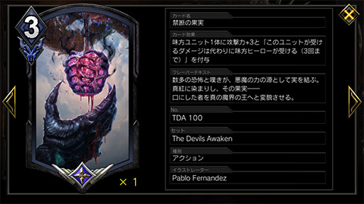 場に出ている「エリミネーター」を「ウィリアム・バーキン」「サイコパワー」などで強化するのは「俊敏」の能力と相まって強力だが,それらのバフの中でもっとも強力なのが,新レジェンダリーの「禁断の果実」。攻撃力+3の効果に加えて,ユニットが受けるダメージを3回まで味方ヒーローが肩代わりする効果を持つため,相手は強化された「エリミネーター」の除去が非常に困難になるのだ。もっとも,こちらのライフに余裕がない状態でこのカードを使うと,あっという間にライフが0になってしまうので,できれば序盤に使っていきたい。