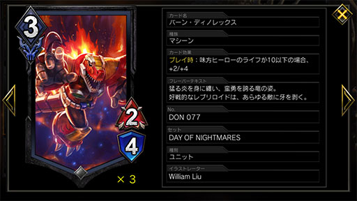 また,条件はライフ10以下と厳しめであるが,満たせば非常に強力なのが「バーン・ディノレックス」。素のスタッツは3MPで2/4なのだが,条件さえ満たせば4/8と倍のステータスになる。ライフ10以下でこのユニットを一気に複数体展開してしまえば,そのまま勝利することも珍しくない。