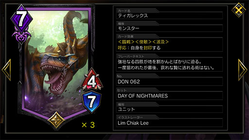 同じく紫単の“4MPモリガン”系のデッキに対しては,こちらのユニットを手札に戻してくる「ベルトウェイ」に対して,有効な対抗策がないのが痛い。盤面の主導権を握れないとそのまま負けてしまうので,早めに「棘飛ばし」のダメージを上げて対抗していこう。また,相手の「ティガレックス」には要注意。3面に並べた盤面を一度に除去されてしまったり,ライフが危うい状態で空き枠を攻められたりすると,一気に押し切られることもあるだろう。