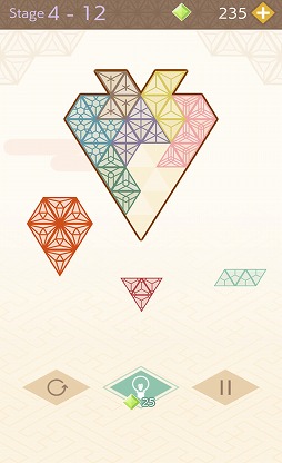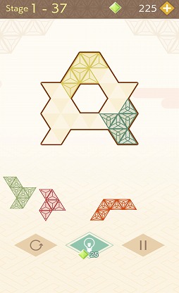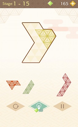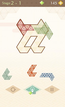 本作は,さまざまな形をした組木を,用意された枠のなかに隙間なくはめ込むゲームだ。スワイプで組木を移動させて,しっかりと収まる組み合わせを見つけよう。