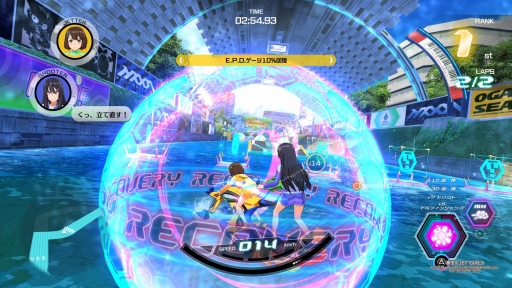 レースを続けて「E.P.D.ゲージ」が20%以上溜まると,それを消費することで機体が変形して最高速度が一気に上がる「ブースト」が使用できる。ゲージが残っていればボタンを押し続けることでブーストを継続できるので,ラッシュを仕掛けたいタイミングまで溜めておくのがオススメだ。