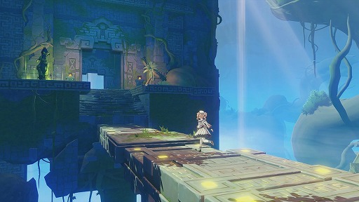 怪しげなオブジェに向けて属性攻撃を仕掛けるとギミックが発動し,宙に浮かぶ床が動き出す。これに乗って次のエリアへ行けるのかと思いきや,途中から道がない。下を見ると雲海で,何も考えずにジャンプをしてみるも,あえなく死亡。ところが,ジャンプ中にもう一度ジャンプボタンを押すと,キャラクターが滑空を始め,無事,向こう岸にたどり着くことができた。