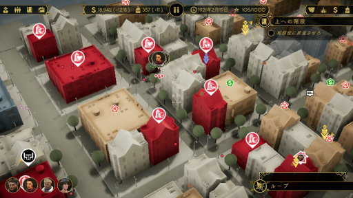 スタート時点で,自分の組織はまだまだ弱小だ。のし上がるには,商売をする建物が必要となる。建物は空いているものを買う,もしくは他の組織や「暴漢」が押さえているものを奪うことで手に入る。序盤は金がないので,ギャングらしく奪い取るといいだろう。