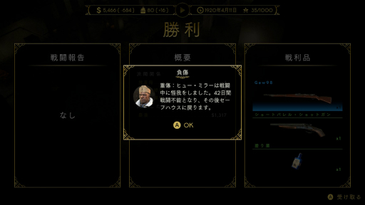 店に自動配備される護衛ではとても歯が立たないし,自分(ボス)が手下を率いて応戦しても被害が大きい。特に,ダメージを受けすぎた者は「重傷」状態となってしばらくパーティを離れてしまうので痛い。そんなことになるよりは,抵抗せずに降参してしまうのが現実的だ。長いものに巻かれつつ,営業停止期間が過ぎたら再び稼ぎ始めよう。ゲームの中でもギャングらしい処世術が有効なのだ。