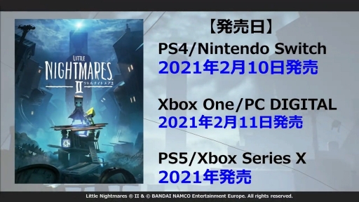 「リトルナイトメア2」は,2020年2月20日にPS4版とSwitch版,2月21日にPC版とXbox One版の発売が予定されている。さらに2021年内には,PS5とXbox Series X版のリリースと,PS4版 / Xbox One版購入者向けの次世代機向けアップグレード対応が行われる予定だ。