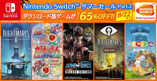 株式会社バンダイナムコエンターテインメントは、本日より『Nintendo Switch サマーセール』Part.2をスタートし、下記の日程で Nintendo Switchのダウンロード版ゲームがお得に買えるセールを実施 いたします。