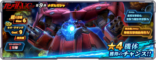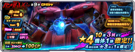 12月1日(木)定期メンテナンス後より、「機動戦士ガンダムUC第9弾CPガシャ」と「機動戦士ガンダムUC第9弾メダルガシャ」の配信を開始いたしました。各ガシャではコスト9でサイズ6の「ネオ・ジオング」が新たに登場いたします。「機動戦士ガンダムUC第9弾CPガシャ」では、新機体の出現率がアップしているほか、初回のみ1回100CPでプレイ可能です。くわえて、10連3回まで★4機体1体が確定で出現し、10連4回目以降は★3以上の機体1体が確定で出現いたします。