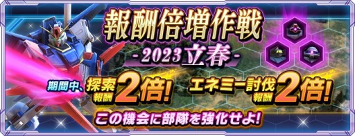 2月9日(木)定期メンテナンス後より、キャンペーン「報酬倍増作戦-2023立春-」を開始いたしました。期間中、戦略エネミー討伐の報酬と、探索の報酬が2倍となり、特別な期間任務が追加されます。