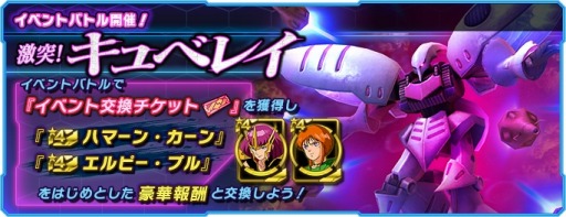 2月9日(木)定期メンテナンス後より、イベントバトル「激突!キュベレイ」を開催いたしました。イベントバトルは開催期間中のみ挑戦でき、通常の部隊とは別に編成したイベント専用部隊でバトルに挑みます。イベント任務の報酬やイベントランキングの入賞で獲得できる「イベント交換チケット」を集めることで、交換所にてキャラクターやアイテムと交換できます。