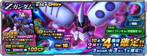 「Zガンダム第16弾CPガシャ」では、新機体の出現率がアップしているほか、初回のみ1回100CPでプレイ可能です。さらに、10連2回まで★4機体1体が確定で出現し、10連3回目以降は★3以上の機体1体が確定で出現いたします。