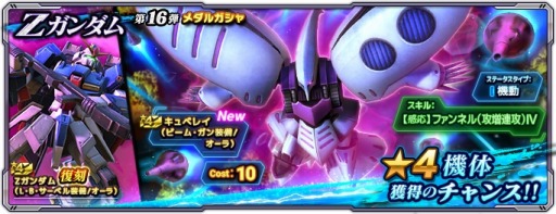 2月9日(木)定期メンテナンス後より、「Zガンダム第16弾CPガシャ」と「Zガンダム第16弾メダルガシャ」の配信を開始いたしました。各ガシャでは、コスト10、サイズ1の「★4 キュベレイ(ビーム・ガン装備/オーラ)」が新たに登場するほか、コスト10、サイズ1の「★4 Zガンダム(L・B・サーベル装備/オーラ)」が復刻登場いたします。