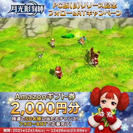 月光彫刻師がPCでより快適にプレイできるWindows PC版公式ランチャー(β版)のリリースを記念して、Twitterフォロー&RTキャンペーンを開催しました。公式Twitterをフォローし、指定の記事をRTした方の中から抽選で50名様に2,000円分のAmazonギフト券をプレゼントいたします。