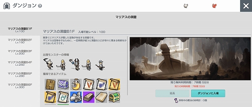 ダンジョンに新しく「マリアスの洞窟」が実装されました。全6階層からなるダンジョンで、レベル100以上から入場できます。また、毎週8時間まで利用でき、新規装備「遺物」などの様々なアイテムが獲得できます。ぜひ新規ダンジョン「マリアスの洞窟」に挑戦してみてください!