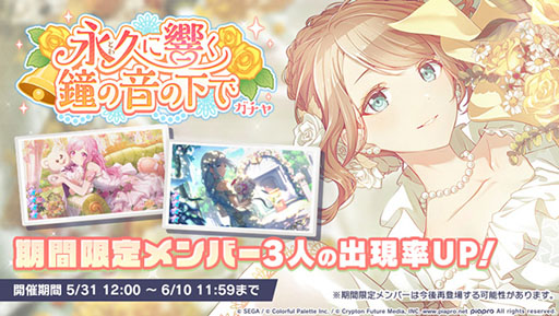 株式会社セガ(本社:東京都品川区、代表取締役社長COO:杉野行雄)と株式会社Colorful Palette(本社:東京都渋谷区、代表取締役社長:近藤裕一郎)は、iOS/Android向けリズム&アドベンチャー『プロジェクトセカイ カラフルステージ! feat. 初音ミク(以下、プロジェクトセカイ)』について、2023年5月31日(水)よりゲーム内イベント「隣に立つ、優しいあなたへ」、「永久に響く鐘の音の下でガチャ」を開催中です。