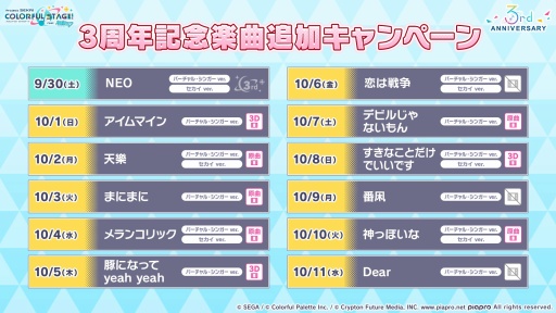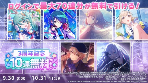 もちろん,3周年記念のキャンペーンも開催される。期間中にログインすればクリスタル5000個と,[3周年記念]10連無料ガチャチケットが最大7枚プレゼントされる「3周年記念ログインキャンペーン」,そして周年恒例の「3周年記念楽曲追加キャンペーン」では12日間連続で書き下ろし楽曲から人気楽曲まで追加される。