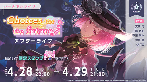 イベント終了後には「バーチャルライブ」でのアフターライブとして、「Choices for the future アフターライブ」を開催いたします。