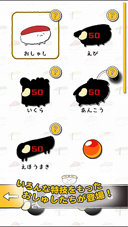 スタンプを集めてパワーアップ!ゲームを遊ぶと、おしゅしのスタンプがもらえるよ!スタンプをそうびすると、キャラがどんどん強くなる!
