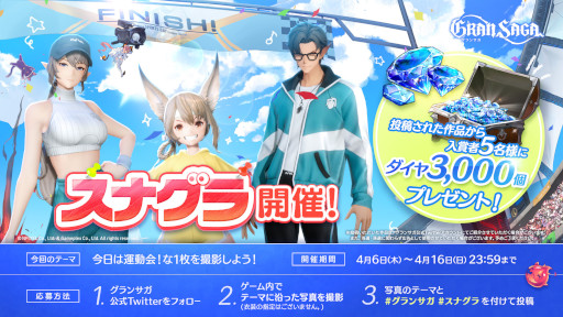 また、グランサガ公式Twitterでは本日15時より、「今日は運動会!」をテーマにスナップ写真コンテストを開催いたします!投稿された作品から、入賞者5名様を対象にダイヤ3,000個をプレゼントいたしますので、奮ってご参加ください!