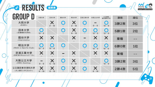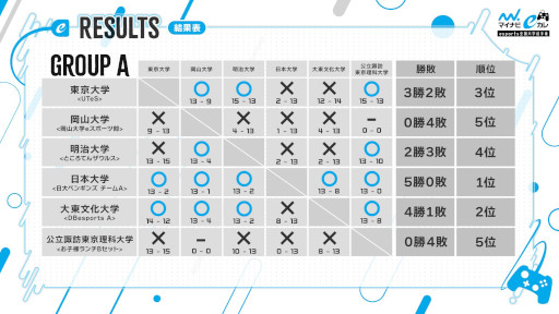 〈グループA〉6チームが参加したグループAを勝ち抜いたのは日本大学 日大ペンギンズ チームA。ゲーム内最高ランクのレディアントプレイヤーを要する大東文化大学 DBesports Aとの戦いを制し決勝大会進出を決めた。細かい戦術とその戦術を遂行する高い技術を持ち合わせたチーム。