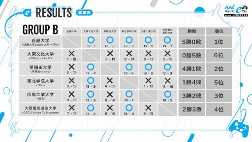 グループBを勝ち抜いたのは近畿大学 近畿大学esportsサークル。リードを取られても落ち着いたプレーで自分たちの流れにゲーム全体を変えていく我慢強さが特徴的。チームで足並みを揃えて行う『リテイク』の練度の高さに注目。