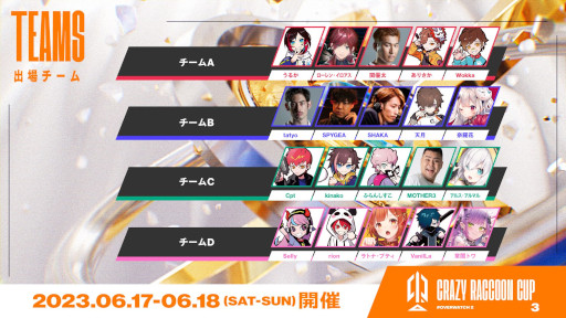 「第3回Crazy Raccoon Cup Overwatch 2」が6月17日・18日に開催される。人気ストリーマー20名が4チームに分かれて,開幕したばかりのシーズン5で競い合うそうだ。