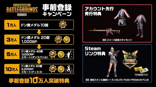 また,本日開始となった事前登録キャンペーンでは,事前登録者数に応じて,サービス開始時にクレートを無料でオープンできる「ドン勝メダル」や,アイテムと交換ができる「BP」などがプレゼントされるという。さらに,事前登録キャンペーンと連動して,アカウント先行発行特典やSteamリンク特典も用意しているとのことなので,詳しくは以下のリリース文を参照してほしい。