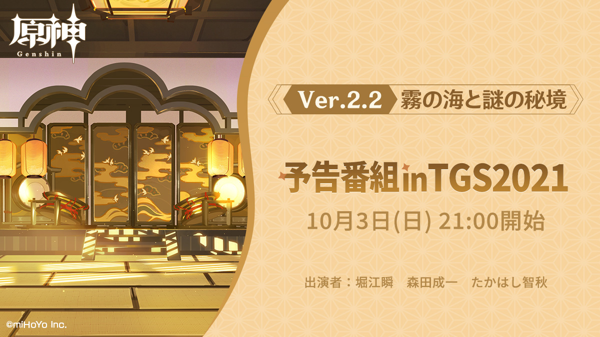 「原神」Ver.2.2の予告番組がTGS 2021にて10月3日21時より配信へ。声優の堀江 瞬さん,森田成一さん,たかはし智秋さんが出演