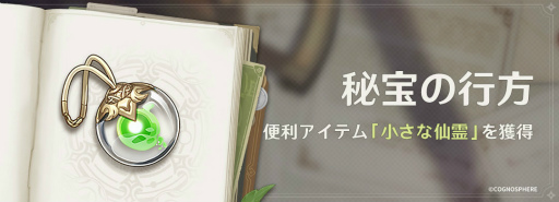 現在、イベント「秘宝の行方」を開催中です。イベント期間中、「宝探し仙霊」と共に宝を探すと、イベント商店で限定便利アイテム「小さな仙霊・翠苔」「小さな仙霊・紫苑」「小さな仙霊・露草」「小さな仙霊・薄紅」「小さな仙霊・鬱金」から1つを選び交換できる他、原石、天賦育成素材、武器突破素材、大英雄の経験、仕上げ用魔鉱、モラなどの報酬とも交換できます。
