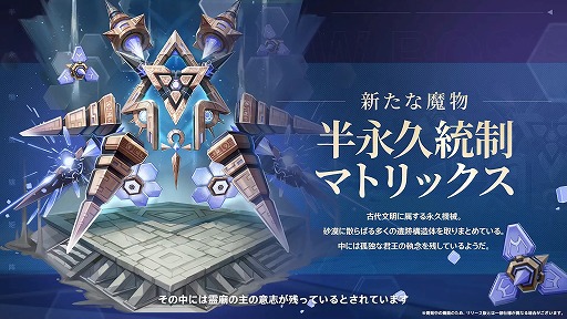 砂漠にはハゲワシやサソリといった砂漠特有の生物に加えて,古代文明に作り上げられた機械のような魔物「半永久統制マトリックス」も登場する。浮遊する巨大なドローンのような姿をしており,巨大なレーザーによる協力な攻撃を持ち,コアを隠して攻撃を受け付けない“インビジブル”状態になれるなど,多彩な攻撃方法が用意されているようだ。