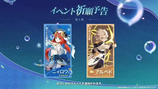 後半ではニィロウのイベント祈願「優々たる蓮歌の舞」が開催されるほか,アルベドの復刻イベント祈願「深秘の生息」も実施される予定だ。キャンディスの出現確率が上昇するのは前半だけなので注意しておこう。