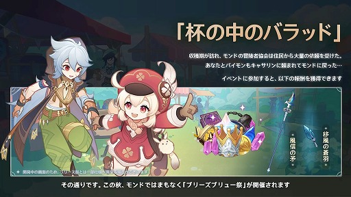 それに加えて,Ver.3.1の期間中のイベント情報も公開された。最初に紹介されたのは,テーマイベント「杯の中のバラッド」だ。こちらのイベントに参加すると,★4長柄武器の「風信の矛」と,その精錬素材,原石,知恵の冠,キャラクター経験値素材など,多数の報酬を獲得できる。