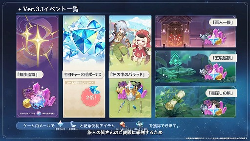 また,秘境のウィンドコインを収集する「五風巡察」,未来星の痕跡を探索する「星探しの旅」,再度の開催となる「百人一揆」といった新たなイベントに加えて,ログインボーナスイベントも開催される。