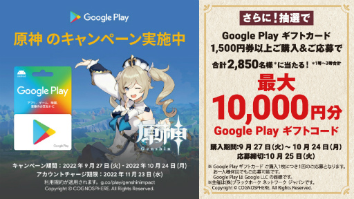 株式会社ローソン(本社:東京都品川区)は、全国のローソン店舗(一部店舗を除く)で、オンラインゲーム『原神』とコラボした Google Play ギフトカードキャンペーンを2022年9月27日(火)より実施します。