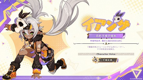 ◆「豊穣の邦」トレーニングジムのトレーナー。ナタの有名な栄養士。 強力なサポート能力を持ち、戦闘では出場キャラの攻撃力をアップさせるほか、チームメンバーの回復もできる。