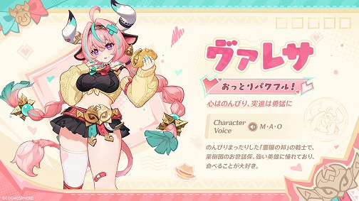 ◆のんびりまったりした「豊穣の邦」の戦士で、果樹園のお世話係。強い英雄に憧れており、食べることが大好き。 戦闘では、落下攻撃により「猛烈パッション」状態を発動でき、この状態では雷元素ダメージがアップし、より少ない元素エネルギーで特殊な元素爆発を発動することができる。