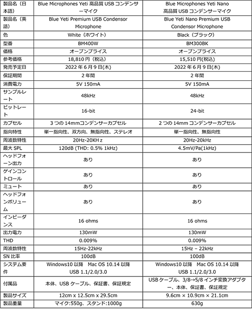 ビジネスデバイスやオーディオ機器などを提供する世界のリーディングカンパニーLogitech Internationalの日本法人、株式会社ロジクール(本社:東京都港区、代表取締役社長:笠原 健司)は、プレミアムマイクブランド「Blue マイクロフォンズ」より、「Yeti 高品質USBコンデンサーマイク」(「以下「Yeti」)の新色Whiteと「Yeti Nano 高品質USBコンデンサーマイク」(「以下「Yeti Nano」)の新色Blackの2製品を2022年6月9日(木)より発売します。価格はオープン価格で、参考価格は「Yeti」18,810円(税込)、「Yeti Nano」15,510円(税込)です。