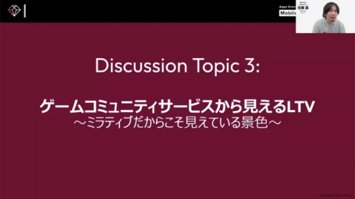 3つめのテーマは「ゲームコミュニティサービスから見えるLTV」で,赤川氏がゲーム配信サービス・Mirrativの事例を紹介した。赤川氏は,柳原氏と井口氏の話が本質的なものであるとしたうえで,「コミュニティを盛りあげるには,自分事化してもらう,自分の物語にしてもらうことが重要。そのためにはユーザーにSNSなどで発信してもらう必要がある」とする。