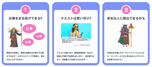 価格:アプリは無料です。利用者は依頼したクエストに応じて、クエスト成功報酬を勇者へ支払います。