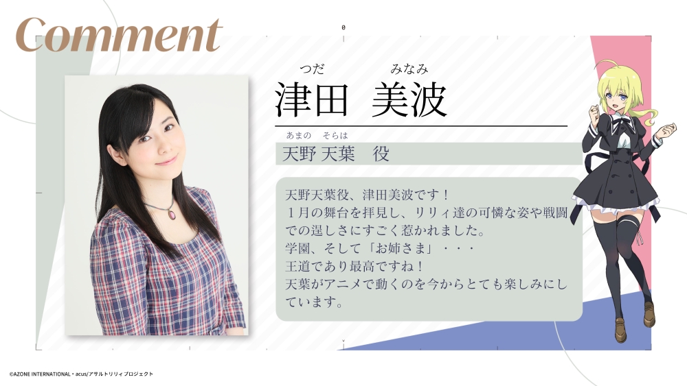 アニメ「アサルトリリィ BOUQUET」の追加キャラクター&キャストが4週連続で公開。第1弾として天野天葉役津田美波さんの出演が発表