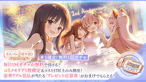 毎日ガチャを無料で引ける「ラスバレ2周年祭り 〜ぽかぽかの宴〜 ★5確定!無料1回ガチャ」や、期間中1回限定の「ラスバレ2周年祭り ★5 100%!! 大感謝無料11回ガチャ」を開催!