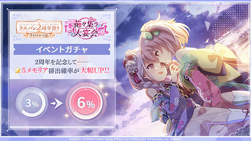今回の「花々集う大宴会イベントガチャ」は、2周年を記念して★5メモリアの排出確率が大幅UPの6%となります。