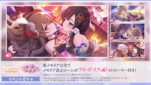 ★5メモリア「Cherishing」「止めどない熱」「変わらない絆」「ふたりのヒメゴト」の4枚が初登場する、「花々集う大宴会イベントガチャ」を開催します。